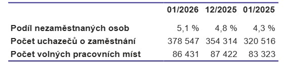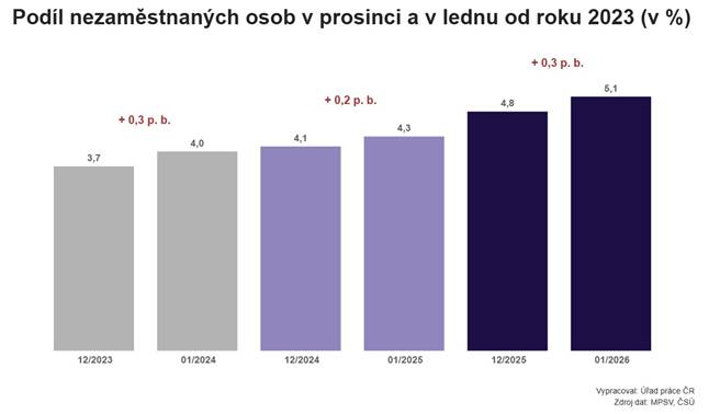09.02.2026 Lednová nezaměstnanost v Česku vzrostla na 5,1 %, projevila se sezónnost i změny podpory v nezaměstnanosti
