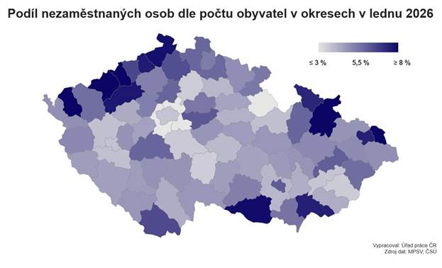 Nejvyšší podíl nezaměstnaných osob zaznamenaly okresy Most (10,3 %), Karviná (9,9 %), Bruntál (9,3 %) a dále Sokolov (8,2 %), Chomutov (8,0 %) a Znojmo (7,9 %). Naopak velmi nízkou nezaměstnanost, tedy pod 3 %, eviduje Úřad práce ČR tradičně v okresech Prahavýchod a Praha-západ a také v Rychnově nad Kněžnou. Meziměsíčně došlo k nárůstu PNO v 74 okresech – k největšímu nárůstu došlo v okresech Znojmo, Jindřichův Hradec a Jeseník (o 0,9 p. b.), Bruntál a Český Krumlov (o 0,8 p. b.) a dále v okresech Písek, Děčín, Chrudim a Louny (o 0,7 p. b.). V okrese Praha-východ a Praha-západ zůstal PNO na stejné úrovni jako v prosinci 2025. Meziročně se pak v lednu tento ukazatel nejvíce zvýšil v okresech Sokolov (o 1,9 p. b.), Most a Česká Lípa (o 1,5 p. b.).