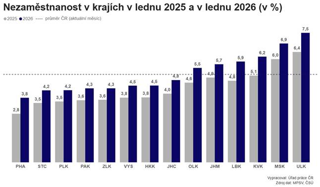 V rámci krajského srovnání zůstává nejvyšší podíl nezaměstnaných osob (dále „PNO“) v Ústeckém kraji (7, 5 %) a v Moravskoslezském kraji (6,9 %). V porovnání s prosincem vzrostl podíl nezaměstnaných osob ve všech krajích, nejvíce v Jihočeském kraji (o 0,6 p. b.), dále v kraji Libereckém, Karlovarském, Olomouckém, Ústeckém, Královehradeckém, Pardubickém a v kraji Vysočina (o 0,4 p. b.) a nejnižší nárůst nezaměstnanosti byl tradičně zaznamenán v Praze (o 0,2 p. b.).